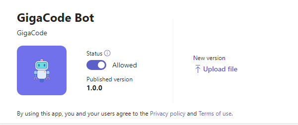 Let's click on our bot and take a look at the options real quick before moving on. Note the Upload File button under New version. This is where you can provide new packages with updated commands or logos