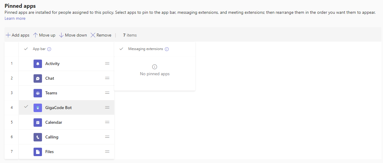 In the Pinned apps section, we can define what should show in the left navigation bar in the teams client and its order for our users. You can add your bot here to make it highly visible and drive further adoption<br>